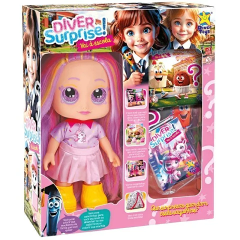 Boneca Diver Surprise Vai à Escola com um look escolar encantador, ela vem pronta para mais um dia de aula e muita diversão! Vem com uma linda mochila, caderninho e canetinhas para você escrever ou desenhar no seu caderninho e também colorir sua mochila. Vem com 3 saquinhos surpresa com acessórios diferentes! Tamanho aproximado da boneca 26,5cm de altura.