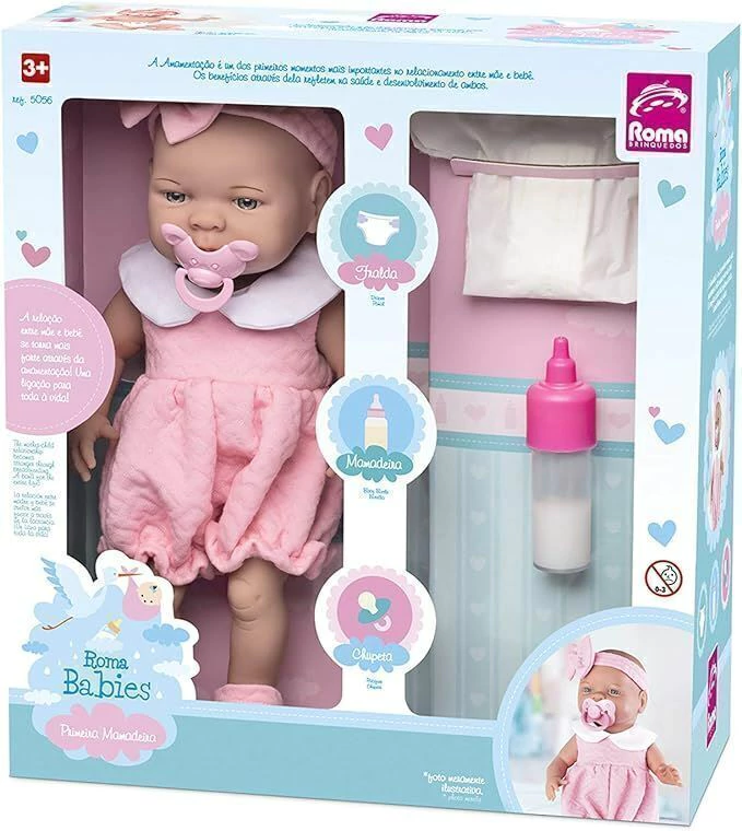 Roma Babies - Primeira Mamadeira representa o momento de carinho entre a mamãe e o bebê. Vem com mamadeira mágica de leite, uma chupeta, uma fralda, além de uma linda roupinha com tiara. A amamentação é um dos primeiros e mais importante momentos no relacionamento entre mãe e bebê!