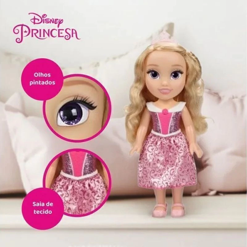 A Boneca Toddler Princesa Disney Aurora tem 38 cm de altura e foi feita com o carinho e a mágica que a realeza merece. Com sapato removível, olhos pintados e uma roupinha temática da história, ela vai ser a protagonista das melhores histórias e brincadeiras da criançada.