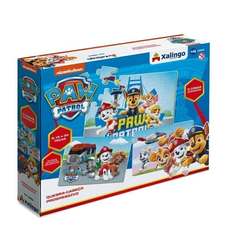 O Quebra-Cabeça Progressivo Patrulha Canina da Xalingo, possui 53 peças em madeira MDF reflorestada composto de 3 quebra-cabeças, com 3 estágios para as crianças aprenderem progressivamente.